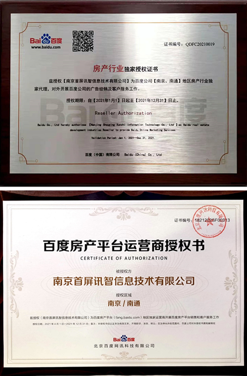 會上,百度公司正式授權南京首屏訊智信息技術有限公司為南京、南通地區(qū)房產行業(yè)獨家代理商及百度房產平臺南京、南通地區(qū)獨家運營商,并頒發(fā)授權證書。首屏訊智自2004年成為百度合作伙伴,始終致力于為廣大企業(yè)提供優(yōu)質的互聯(lián)網營銷服務。擁有17年豐富互聯(lián)網行業(yè)服務經驗的首屏訊智,已服務南京企業(yè)2萬余家,助力廣大企業(yè)快速穩(wěn)健發(fā)展。